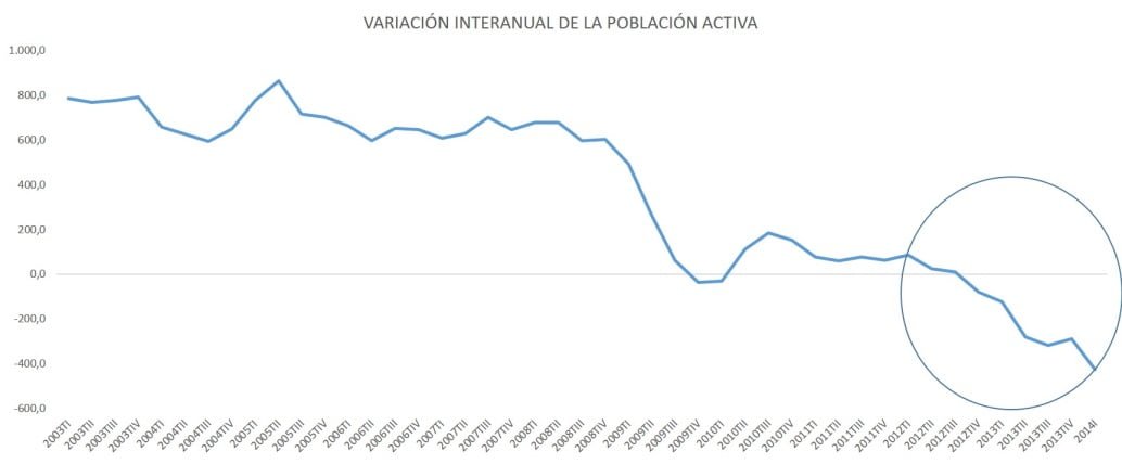 Lo que sí resulta más que significativo es la caída espectacular de los activos. Hoy se ha publicado la mayor caída interanual de la población activa. Durante el último año hay 424000 personas activas menos y desde el segundo trimestre del 2012, estamos asistiendo a una caída histórica de la población que está dispuesta a trabajar. El abandono de la actividad ante la vuelta a la formación, ante la emigración o simplemente el desánimo es la nota más llamativa de los datos publicados. En cuanto los que emigran, podemos hablar de movilidad o de expatriación forzosa, pero en ambos casos, estamos asistiendo a una fuga de cerebros que pronto hará resentir nuestra economía. Los organismos internacionales así ya lo están señalando.